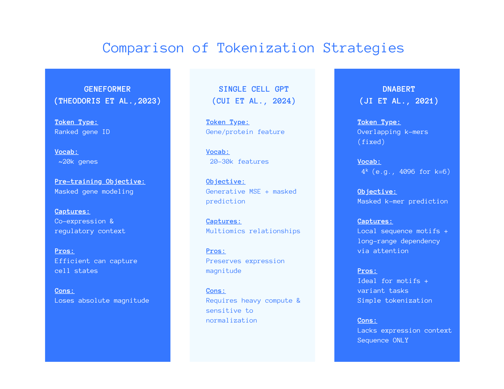 Tokenization defines the interface between scRNA-seq and transformers. Each approach makes different assumptions about biological structure, and these assumptions determine what the model can ultimately learn.